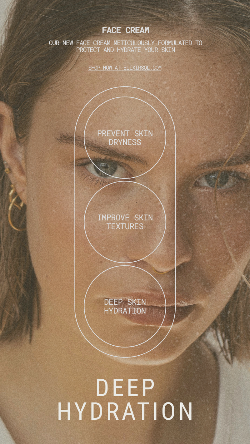 Elixir Sol was designed as a full-body sensory ritual, meant to be elevated, slow, and grounded in touch. From the first scroll to the final swipe of cream, every interaction is intentional. Think soft, cinematic visuals, ingredient-led storytelling, and messaging that educates through beauty, not pressure.